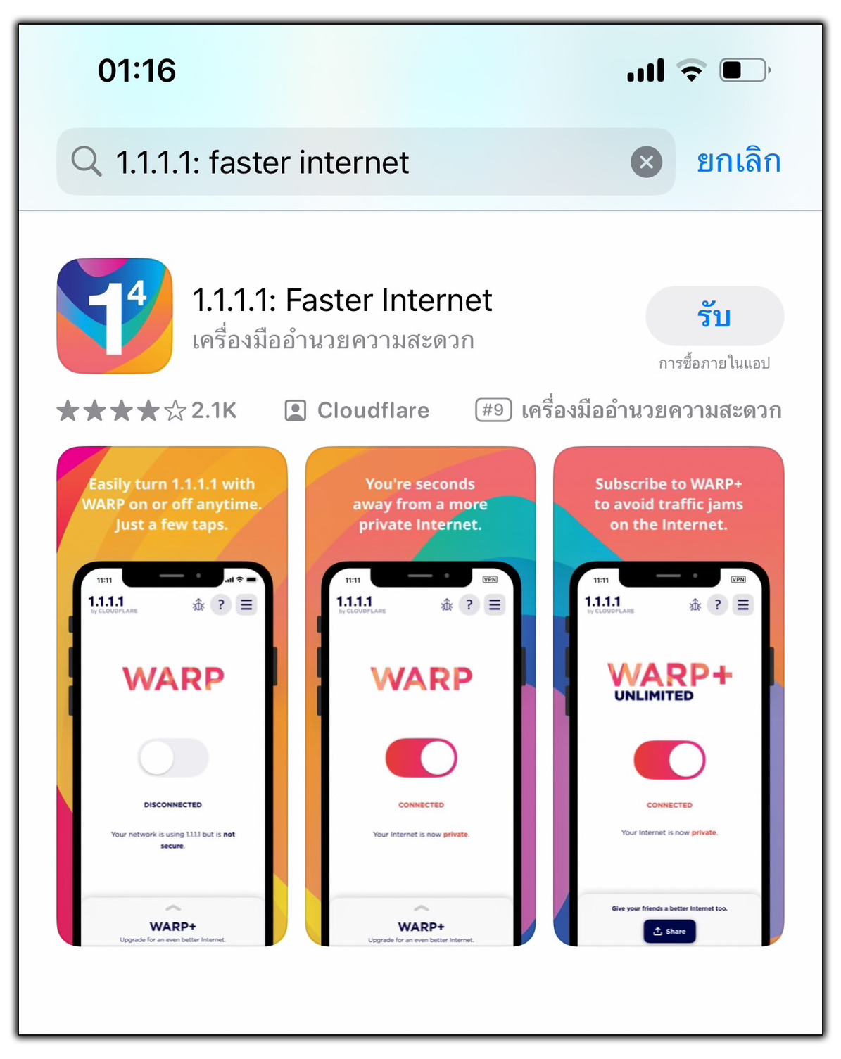 1. ไปที่ App Store แล้วโหลดแอพ ชื่อ 1.1.1.1 Faster Internet
